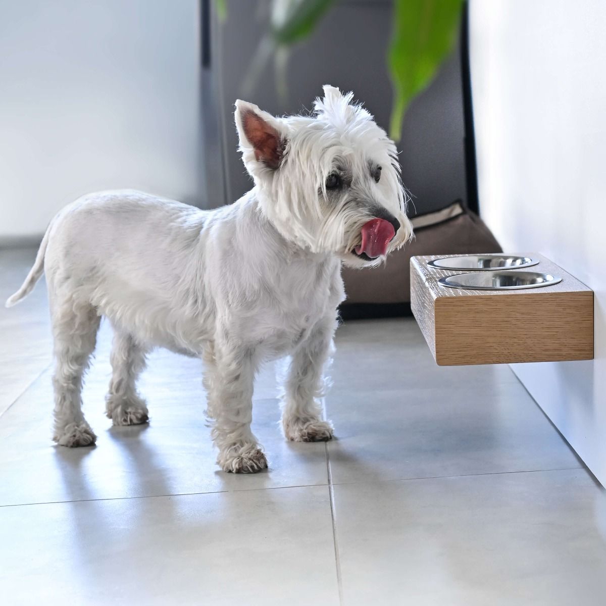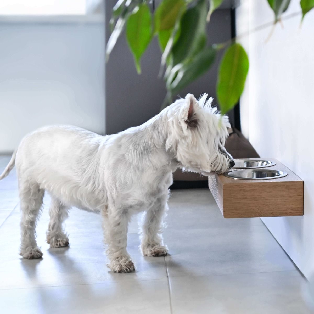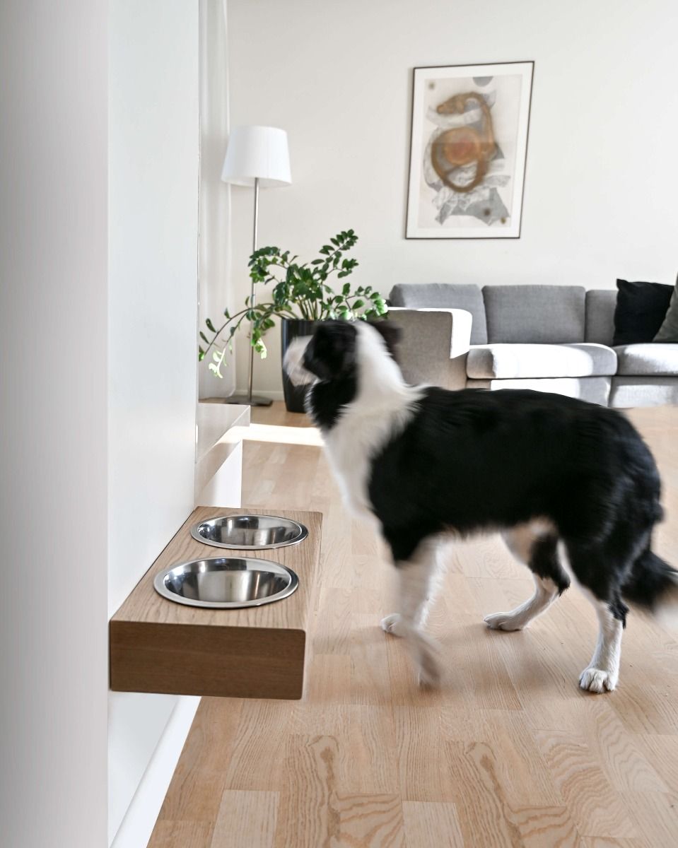 Der schwebende Futter- und Wassernapf wied direkt n see Wand montiert. Die Halterung ist aus Holz mit Futter- und Wasserschüsselhalter aus hygienischem Edelstahl. Danke seines schwebende Zustandes ist eine leichte Reinigung des Bidens garantiert.
